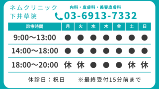 お知らせ 診療時間拡大と変更のお知らせ 皮膚科の医師が新たに加わり、診療日時が拡大いたします。(8月1日より)土・日・月・火:9時~18時水・木・金:9時~20時(13時~14時は休診時間となります)※美容皮膚科は10時~のご案内となります休診日:祝日院長の診察日は現状と変わらず... 2025.07.29 お知らせ
