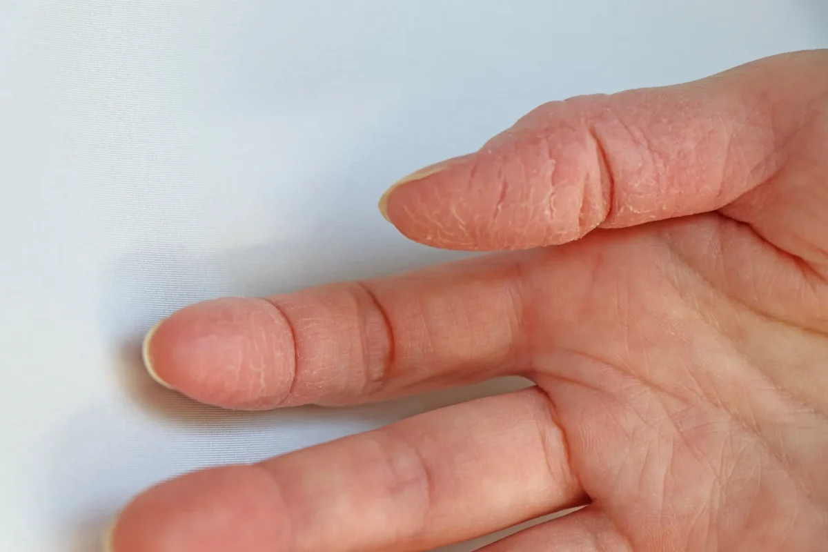 指先は皮脂腺が少なく、乾燥しやすい部位です。また、日常生活で最も使う部位のため、摩擦や刺激を受けやすく、切れやすくなります。
